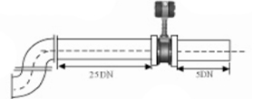 5.不同平面兩個(gè)彎管的安裝 如果流量計(jì)的前端有兩個(gè)90°彎頭,要保證流量計(jì)的前直管段≥25D,后直管段≥5D |