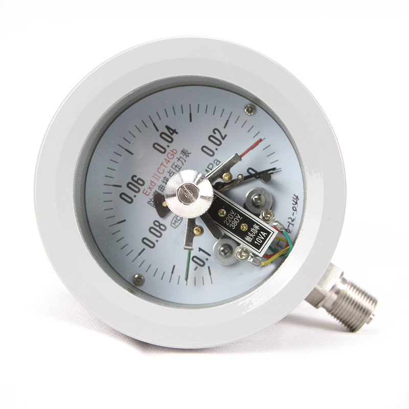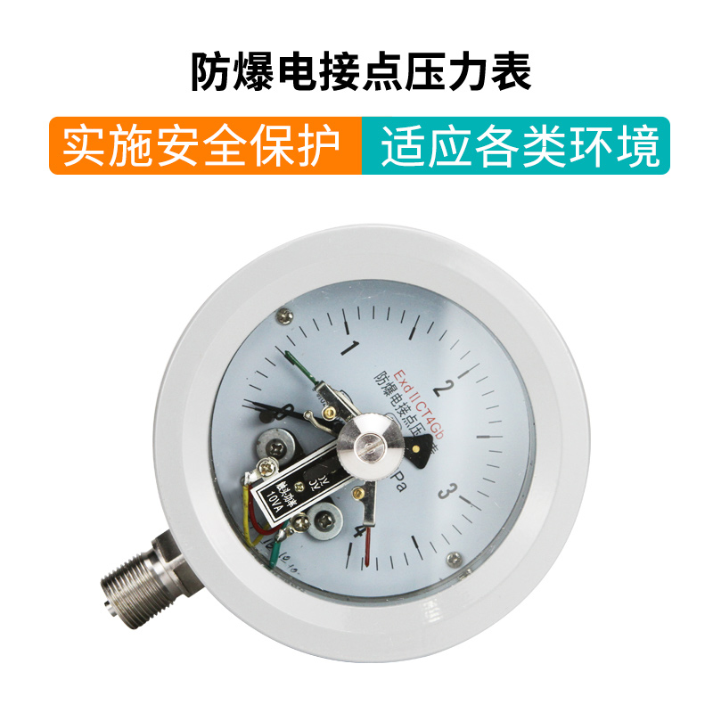 防爆電接點(diǎn)壓力表的工作原理是基于檢測元件(測量系統(tǒng)中的彈簧管)的彈性變形,通過機(jī)械傳動使之帶動電接點(diǎn)組中的觸頭產(chǎn)生相應(yīng)的動作(閉合或斷開)以使控壓系統(tǒng)中的電路得以接通或斷開,從而實(shí)現(xiàn)自動控制報警和現(xiàn)場指示的目的。